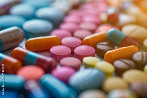 An assortment of colorful medicinal tablets and capsules, showcasing the diversity of healthcare options. , background blur