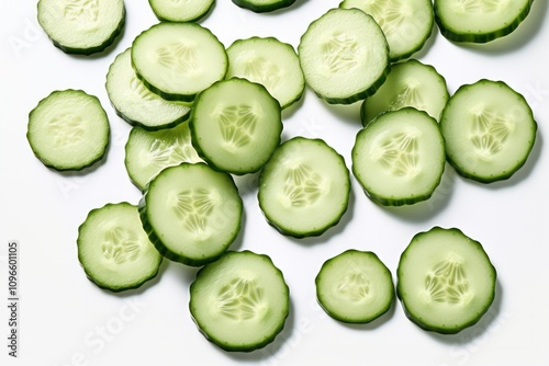 An assortment of cucumber slices with varying thicknesses, revealing the rich green hues and seed patterns