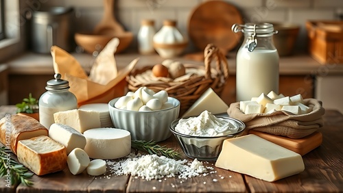 An assortment of dairy products arranged on a wooden table in a rustic kitchen.