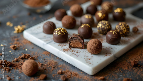 An assortment of hand-crafted chocolate truffles arranged on a marble board, with cocoa powder and gold leaf accents. The warm tones highlight luxury and sweetness.