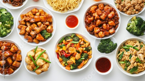 An assortment of popular Chinese stir-fry dishes, including sweet and sour chicken and vegetable lo mein, arranged attractively on a white surface to highlight the variety of flavors.