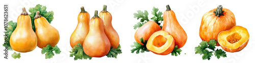 An assortment of vibrant watercolor painted butternut squash pumpkins and gourds in autumn hues This natural seasonal produce display showcases the warm rich colors of the harvest season