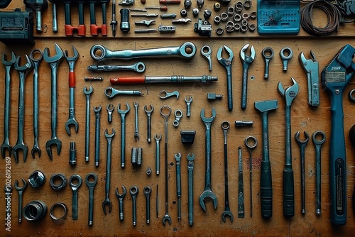 wrench, tool, wooden, surface, metal, assortment, hand, repair, equipment, workshop, mechanic, hardware, spanner, silver, black, open, mains outlet, handle, box, ratchet, screw, drive, nut, bolt, piece, instrument, set, garage, fix, job, work, construction, engineering, industry, maintenance, tighten, loosen, project, bricolage