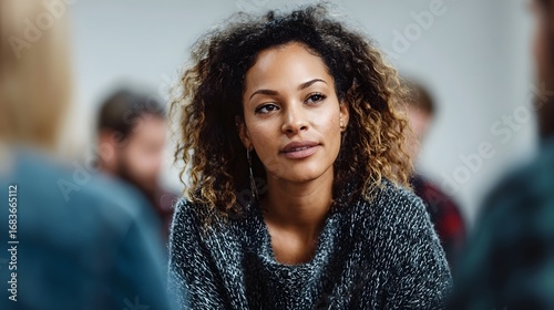 woman, group, discussion, attentive, engaged, meeting, thoughtful, curly, hair, casual attire, female, adult, young, brown, person, people, support, therapy, listening, speaking, talking, sharing, center, serious, pensive, expressive, focused, connection, communication, empathy, understanding, learning, education, audience, indoor, daylight, natural, light, warm, cosy, sweater, knit up, grey, closeup, portrait, gathering, informal, social, interaction
