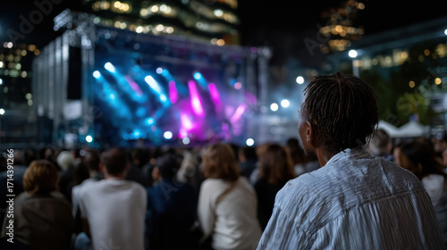 An audience gazes at a spectacular live music performance at night, with vibrant lights enhancing the atmosphere and excitement of the event, capturing the essence of entertainment.