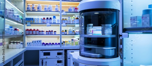 An automated medication dispensing robot in a hospital pharmacy, ensuring accurate and safe distribution of medications.