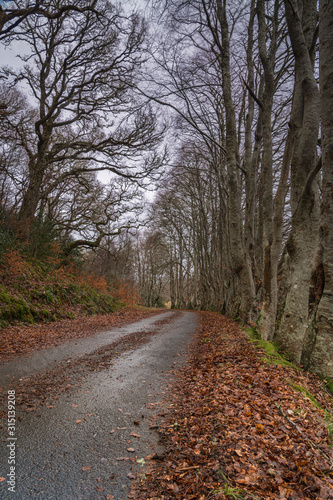 An avenue of European Beech or Common Beech, Fagus sylvatica, lining a single track road taken in winter near Plockton, Scotland. 29 December 2019