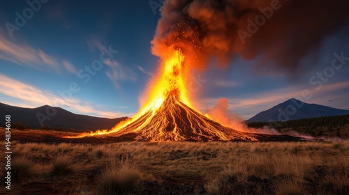 An awe-inspiring image featuring a volcano erupting with fiery lava and ash against a dramatic twilight sky, showcasing the raw power of nature.