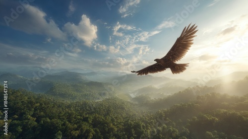 An eagle is soaring in the sky, with green mountains and forests as the background. It is a close-up shot, bathed in bright sunlight