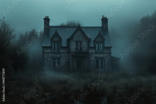An eerie, abandoned stone mansion stands amidst foggy, overgrown surroundings, ideal for projects requiring a spooky or haunted atmosphere such as Halloween promotions, horror movie posters
