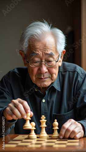 An elderly Asian man focuses intently on a chess game, moving a pawn on the wooden board, showcasing concentration and strategy in a cozy setting