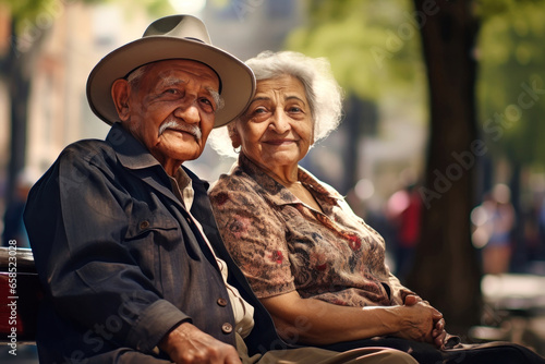 An elderly couple, a man and a woman, are sitting and hugging on a bench in the park. They enjoy communication. Date in the park. Older lovers. Relationships in old age. Love and romance.