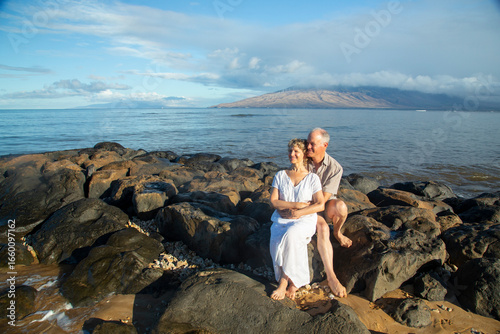An elderly couple sits joyfully on rocky seashore under a bright blue sky. Kepaniwai Park, Wailuku, Hawaii
