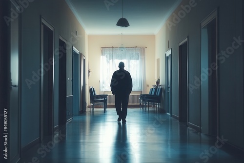An elderly individual strolls through an empty nursing home corridor, embodying feelings of loneliness and isolation in the soft evening light. Generative AI