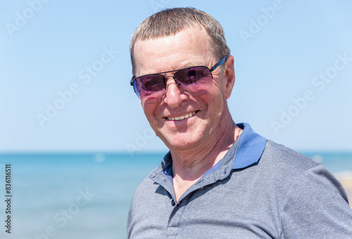 An elderly man in sunglasses at the sea. Tourism and travel. Close-up.