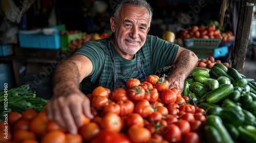 elderly, man, produce, market, joyfully, fresh, tomatoes, cucumber, vibrant, selling, happiness, community, stall, lively, local, business, agriculture, fruit, vegetable, smile, cheerful, entrepreneur, harvest, oasis, bustling, tradition, friendly, organic, farmer, marketplace, life, colourful, abundance, food, capture, social, timeless, exchange, revival, energetic, vintage, nature, connection