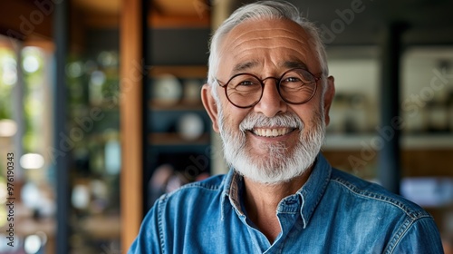 An elderly man wearing glasses and a denim shirt smiles happily in a bright indoor space