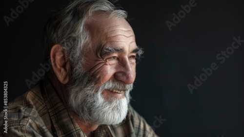 An elderly man with a beard and plaid shirt smiles gently, capturing a moment of serene contentment against a dark backdrop.
