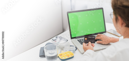 laptop, credit card, person, online shopping, medication, device, home, elderly, health care, modern, light, white, green, convenience, technology, medical equipment, simplicity