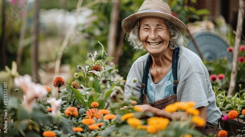 An elderly woman enjoys gardening, surrounded by colorful flowers on a sunny afternoon