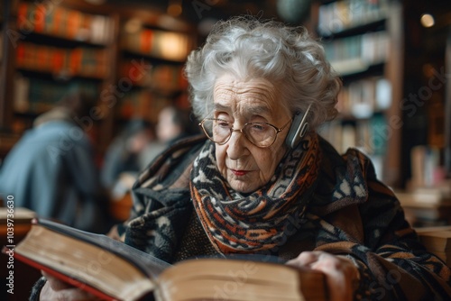 An elderly woman sits engrossed in a book at a cozy library, surrounded by shelves filled with books. Her focused expression suggests a deep connection to her reading material