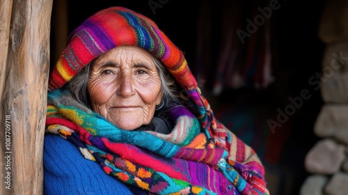 An elderly woman wrapped in vibrant, handwoven clothing smiles gently while leaning against a wooden post outside her quaint mountain home, basking in the afternoon sun