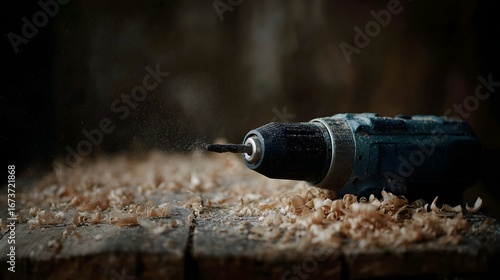electric, drill, bench, wood, shaving, power, tool, equipment, hardware, industrial, work, construction, repair, carpenter's shop, workshop, texture, surface, detail, sharpened, lighting, dark, shadow, gritty, rough, rugged, metallic, closeup, product, life, photo, creative, design, handyman, bricolage, craftsmanship, hobby, professional, practical, functional, hard-wearing, technology, industry, manufacturing, engineering, precision, skill, expertise