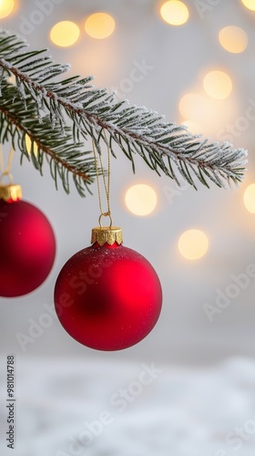 An elegant Christmas decor scene with red and gold ornaments hanging from frosted pine branches, set against a backdrop of softly glowing lights.
