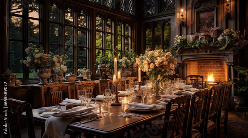 An elegant dining room with a long wooden table set for a formal dinner, bathed in soft candlelight