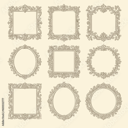 An elegant EPS vector illustration set of vintage hand-drawn frames featuring intricate ornamental designs, flourishes, scrolls, and decorative borders.