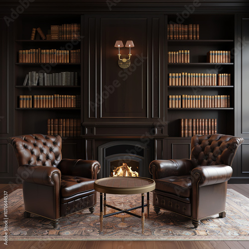 elegant, library, dark, wood, shelf, leather, armchair, cosy, fireplace, escape, stylish, brilliancy, serene, refine, opulent, antique, design, tranquil, homelike, welcome, invite, grandeur, ultra, neutral, background, warmth, splendid, ambience, scene
