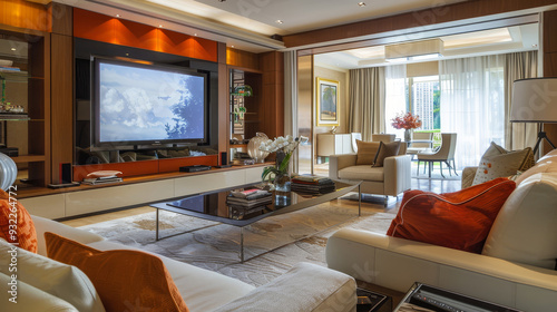 living, room, large, television, screen, modern, decor, elegant, stylish, inviting, entertainment, area, contemporary, design, sophisticated, interior, minimalistic, clean, line, luxury, cosy, furniture, high technology, media, center, home, theatre, comfortable, seating, wall-mounted, vibrant, colours, chic, ambience, roomy, modernist, aesthetic, focal, point, technology