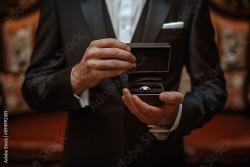An elegant man in formal attire holds a diamond ring in a box, showcasing a moment of luxury and romance
