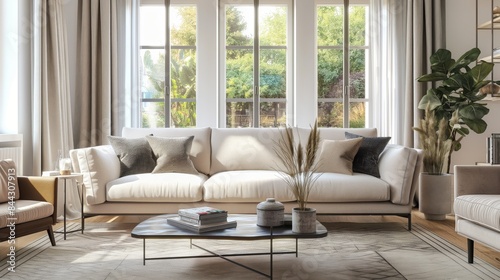 An elegant modern living room featuring a large white sofa with grey and beige pillows, a sleek coffee table, and expansive windows with a view of lush greenery outside.