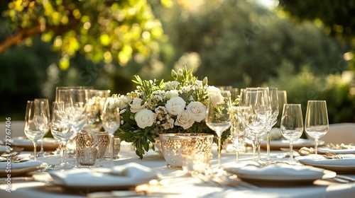 An elegant outdoor dining table beautifully arranged with flowers and glassware, set for a formal event in a garden ambiance, showcasing sophistication and nature's beauty.
