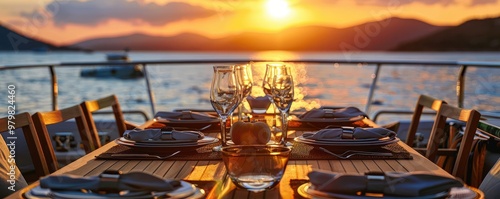 dinner, yacht, sunset, table setting, atmosphere, deck, elegance, romance, luxury, dining, fine dining, glassware, plate, cutlery, sea, ocean, water, evening, ambience, celebration, gathering, tableware, linen, silverware, horizon, leisure, tranquil, serene, exclusive, sophisticated, exquisite, banquet, entertain, gala, cruise, sailing, voyage, nautical, navigate