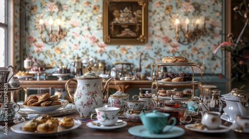 An elegant tea room with vintage china, delicate floral wallpaper, and an array of fine teas and pastries