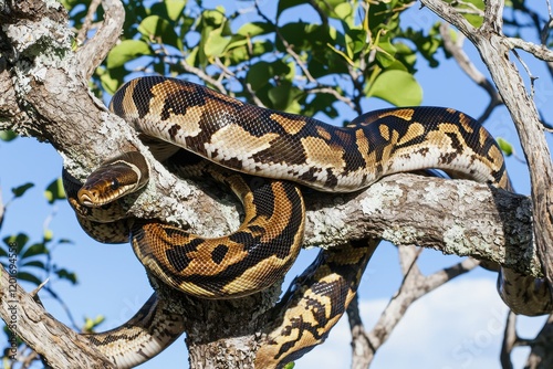 An emerald boa constrictor coiled around a tree branch, its scales shimmering in the sunlight.