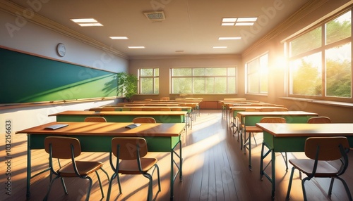 An empty classroom with chairs, desks, and a green chalkboard, illuminated by sunlight, evoking education concept. 3D Rendering