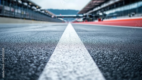 An empty Formula 1 track captured from a close-up perspective, focusing on the white line, showcasing the smooth asphalt surface and sleek design.