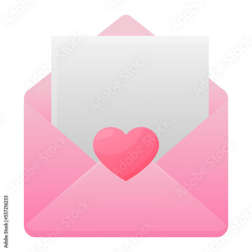 An empty letter in a pink envelope on a white background. A heart on the envelope. Romantic envelope template. Vector