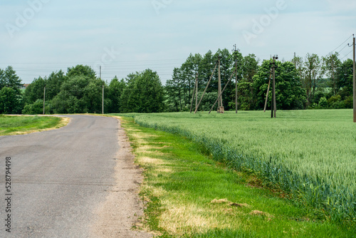 An empty roadway outside the city passes by a rural field and a blooming meadow. Travel by car away from the city and the hustle and bustle. Paved road on a sunny day without cars.
