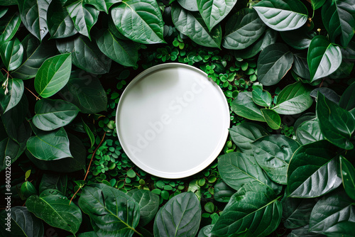 An empty white Ceramic Plate Surrounded by Lush Green Leaves Creating a Natural Setting