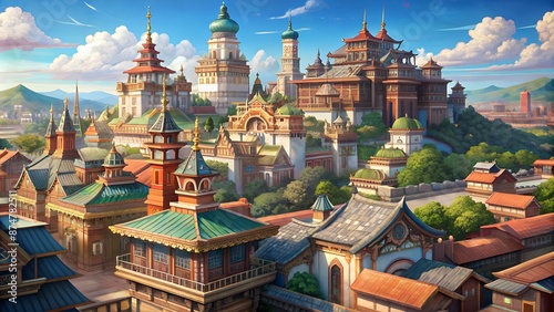 fantasy, city, architecture, illustration, oriental, asian, chinese, japanese, city landscape, skyline, building, tower, temple, palace, house, street, market, people, life, bustling, vibrant, colourful, lively, animated, dynamic, exciting, interesting, captivating, beautiful, stunning, breathtaking, majestic, grand, opulent, magnificent, impressive, imposing, monumental, colossal, huge, expansive, wide, extensive