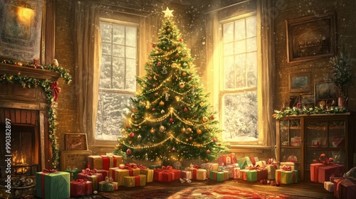 An Enchanting Illustration of a Christmas Tree Surrounded by Presents, Sparkling Ornaments, and Soft Glowing Lights