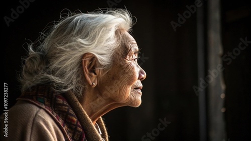 An enchanting image of an elderly person the gentle glow tracing the lines of their face and wispy hair emphasizing a lifetime of wisdom and experience amidst a shadowy void.