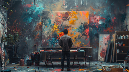 An enchanting riverside studio with a giant wooden worktable covered in colorful paint splashes. An artist stands before a massive abstract painting, lost in deep concentration.