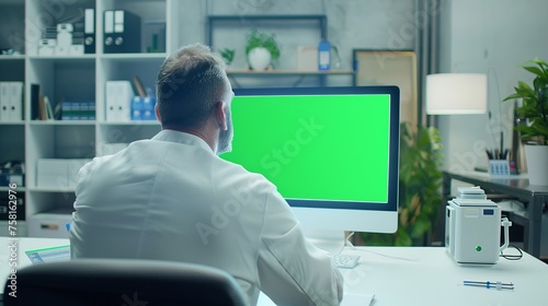 An engineer is looking at the green screen of asus desktop