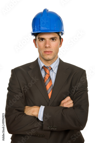 An engineer with blue hardhat, isolated on white