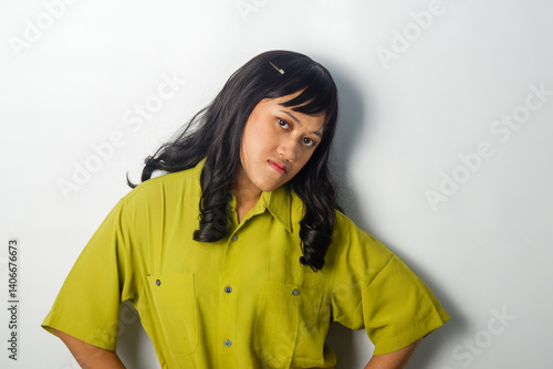 An enthusiastic Asian woman wearing a green shirt, with a serious expression, posing in front of the camera